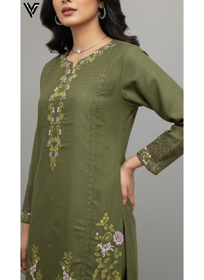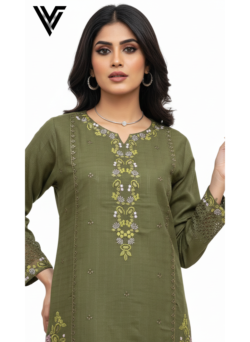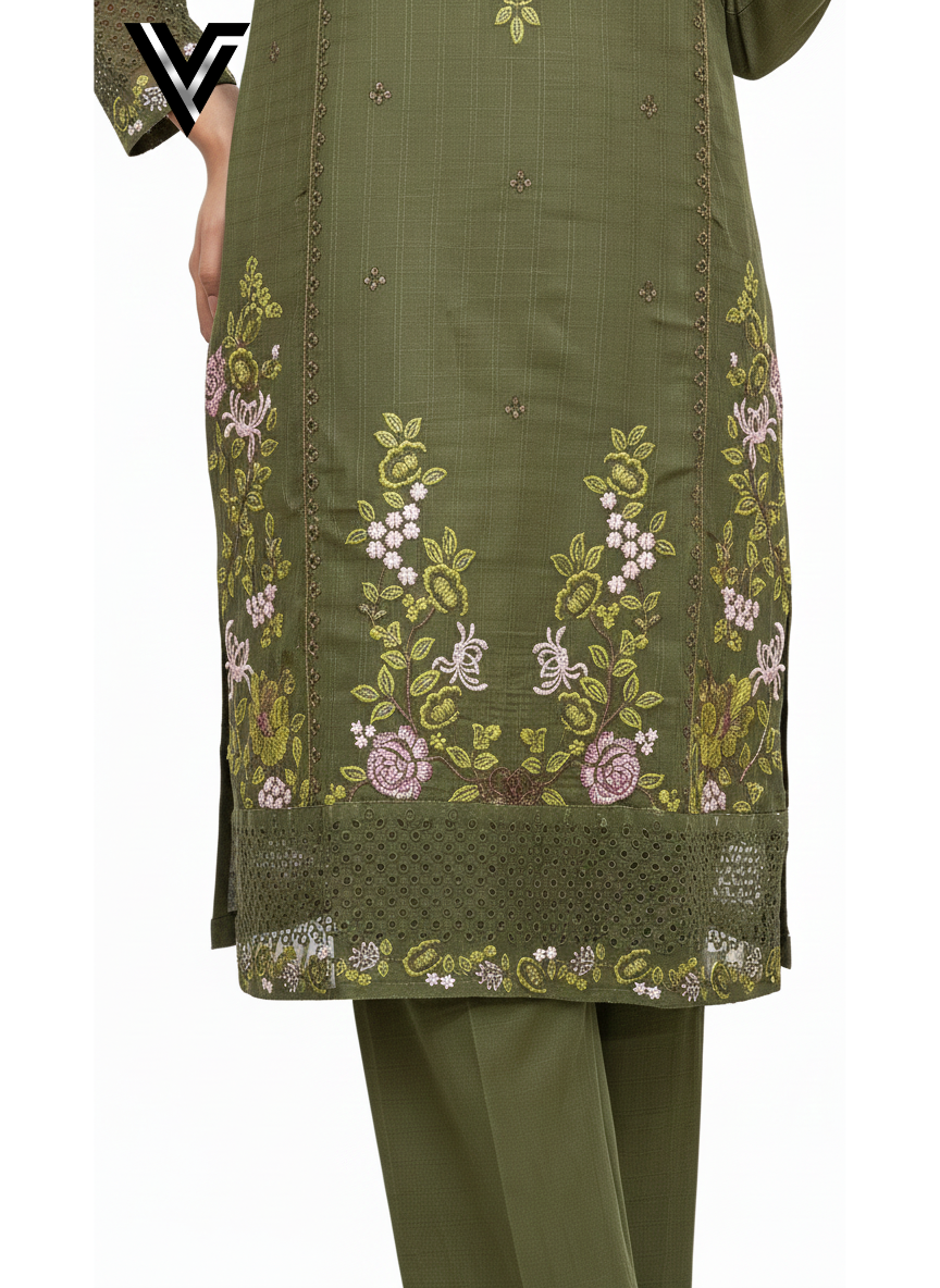 Olive Grace – 3-Piece Embroidered Slub Ensemble | Venixa