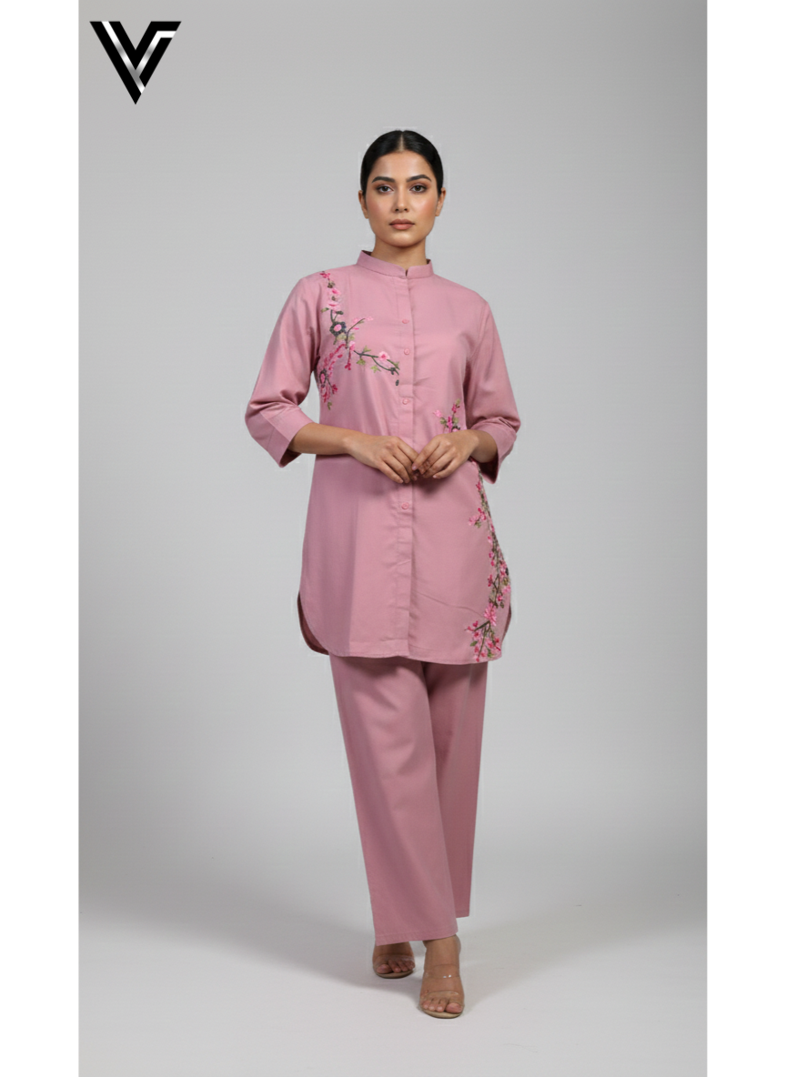 Embrace a soft, modern aesthetic with the “Rose Blush” co-ord set. This elegant two-piece ensemble is rendered in a sophisticated dusty rose hue, offering a refreshing take on feminine styling. The shirt features a clean band collar and a hidden button placket, adorned with delicate, asymmetrical floral vines that creep gracefully across the shoulder and down the side. With a curved hemline and tailored straight trousers, this set is designed for the woman who appreciates minimalist luxury with a touch of botanical artistry.