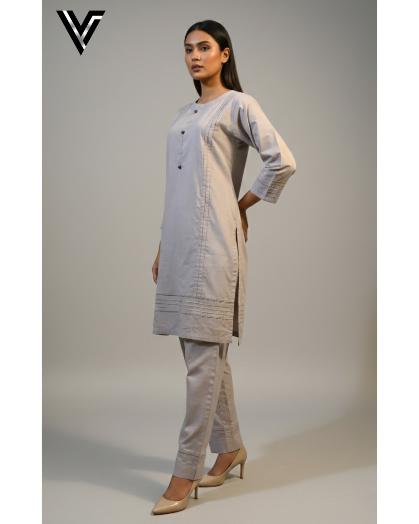 Embrace a minimalist, chic aesthetic with the “Slate Serenity” Premium Mix Cotton 2 Piece Suit. This sophisticated two-piece ensemble is rendered in a versatile pebble grey hue, offering a clean and polished take on modern everyday wear. The shirt features a traditional round neckline with a refined button-down placket and subtle vertical pintuck detailing that runs along the front for a tailored finish. With structured three-quarter sleeves and a straight hemline adorned with horizontal linear stitching, this set is designed for the woman who values understated elegance and effortless grace.