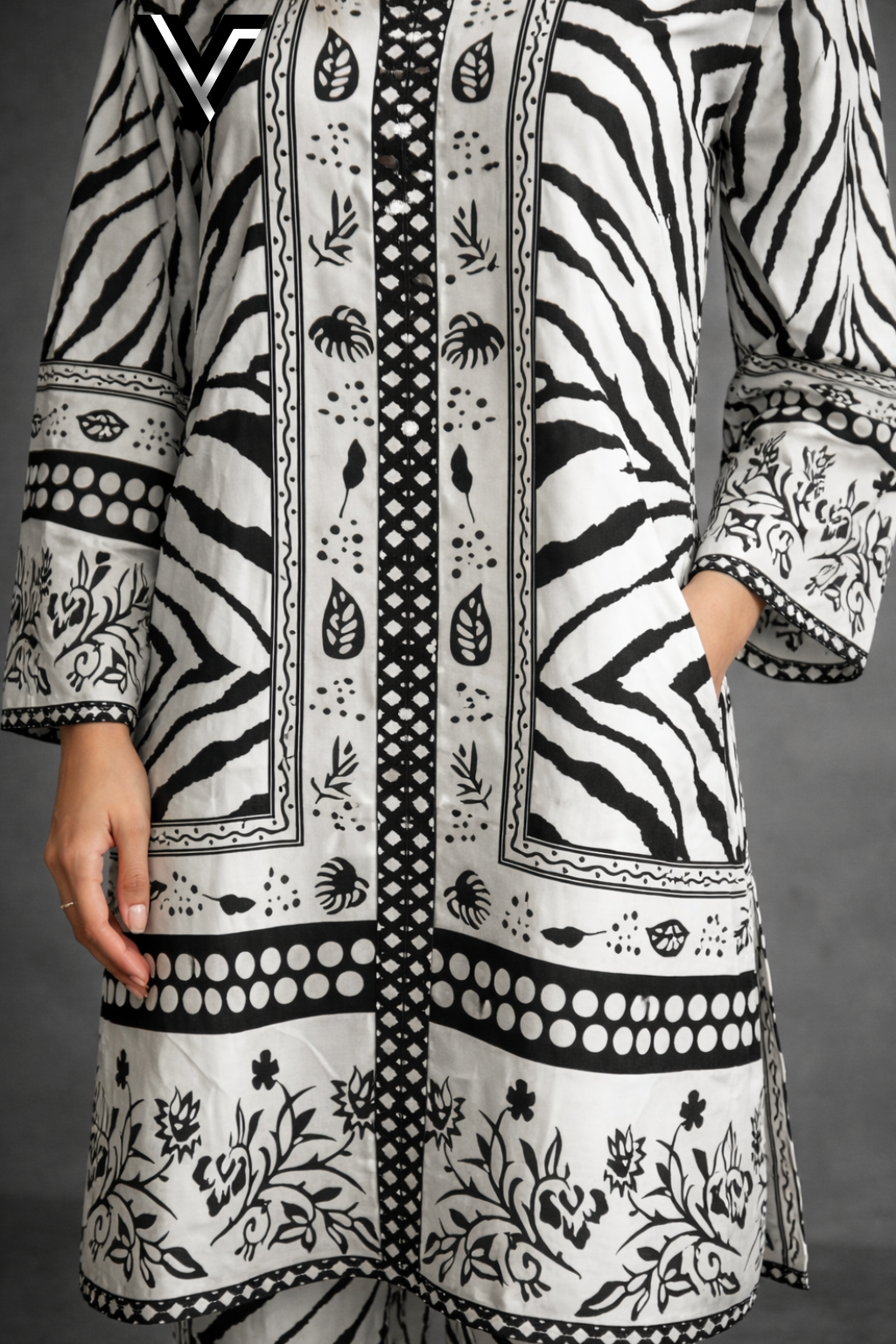 Description: Make a bold statement with the “Monochrome Safari” set, where contemporary art meets wearable fashion. This striking ensemble features a sophisticated fusion of organic zebra-inspired patterns and structured geometric borders. The monochromatic black-and-white palette is broken by intricate floral motifs at the hem and cuffs, creating a balanced and high-fashion aesthetic. Crafted for the bold individual, this straight-cut tunic and wide-leg trouser set is designed to turn heads at any social event or high-end gathering.